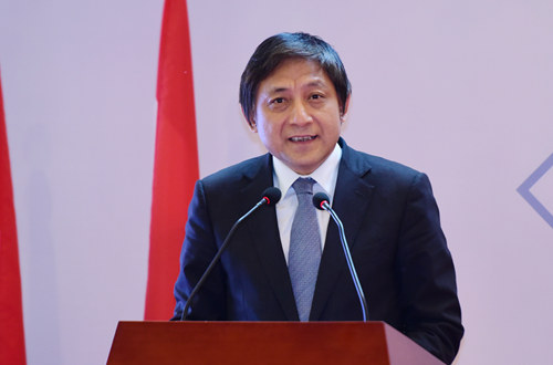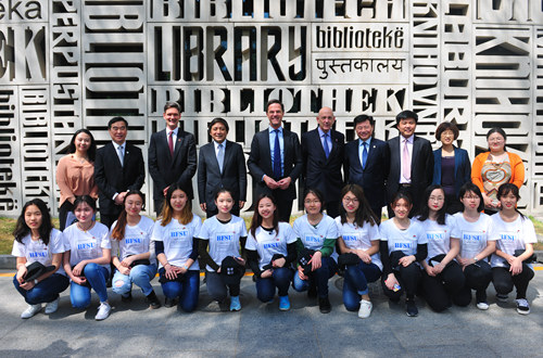 校长彭龙在图书馆举行仪式欢迎吕特来访,中国驻荷兰大使吴恳出席欢迎仪式,欢迎仪式由副校长闫国华主持。
