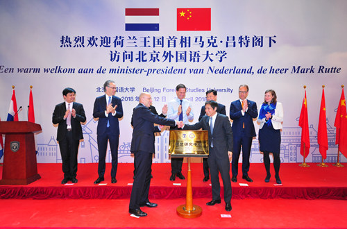 在吕特的见证下,彭龙与荷兰驻华大使高文博共同为北外荷兰研究中心成立揭牌。