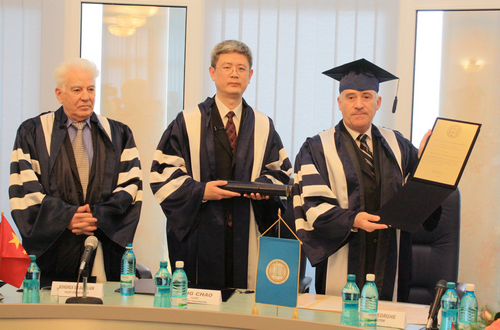 ▲2012年 罗马尼亚斯彼鲁·哈雷特大学授予丁超教授名誉博士学位