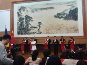 ▲2016年 罗语专业学生在留学期间于中国驻罗使馆与中兴员工合作演出