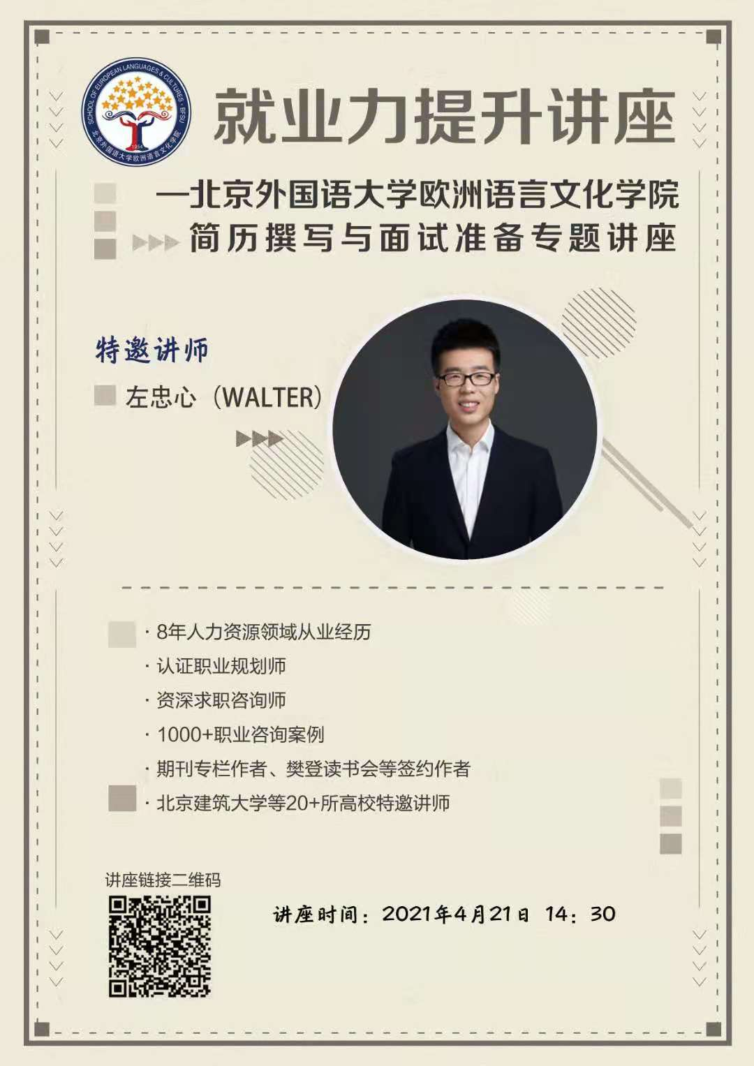 4月21日下午,简历撰写与面试准备专题讲座在线上正式开讲。本次活动的特邀讲师左忠心老师结合beat365官网同学提交的简历,深入翔实地分析了优秀简历的共性。从简历作用、简历撰写前、简历版面、简历内容等五个方面介绍了简历撰写的方法。此外,左老师还简要为同学们讲解了结构化面试的过程和要点。