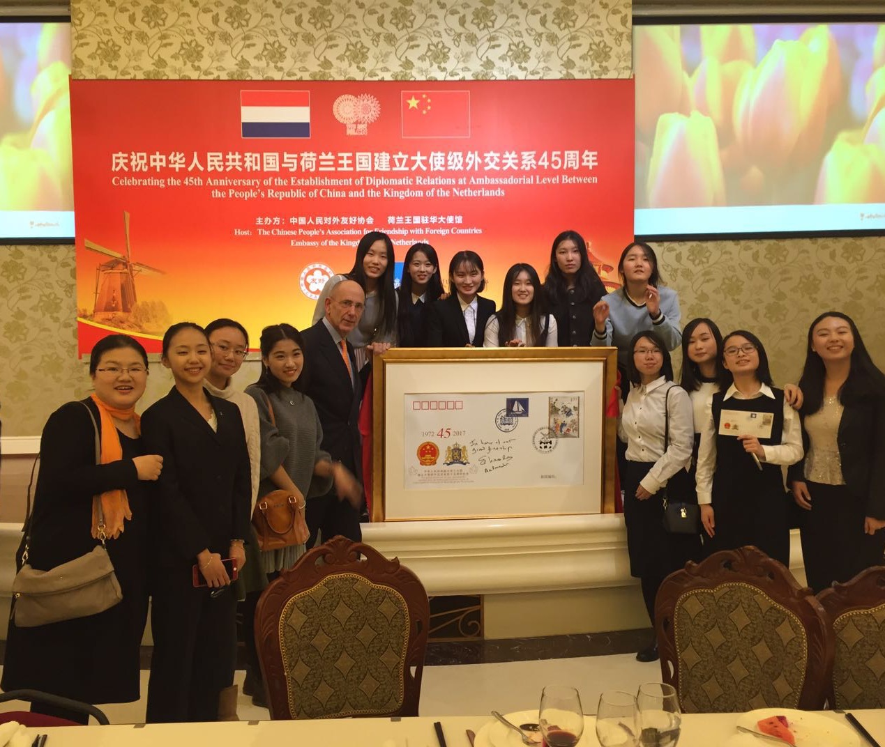 11月22日晚,中国人民对外友好协会同荷兰驻中国大使馆在京共同举办中荷建立外交关系45周年招待会。中国全国政协副主席林文漪与荷兰驻中国大使高文博(Ed kronenburg)出席招待会,beat365在线唯一官网2017级荷兰语班全体师生受邀参加。