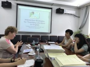 讲座第二部分由古典与现代语言文学系系主任马特兰·达诺娃教授带来。她首先讲述了自己编纂英语教材的完整思路,接着向大家展示了 《LitUps》系列教材的电子版。 教材分为Timelines,It Rocks,Project Working等多个版块,包含历史梳理、名人名事、词汇学习、课后练习等多方面内容,致力于让学生有一个完整的外语学习体验。达诺娃教授总结到,教材最重要的一点是引起学生的兴趣,活跃课堂氛围,达到转换课堂的效果。