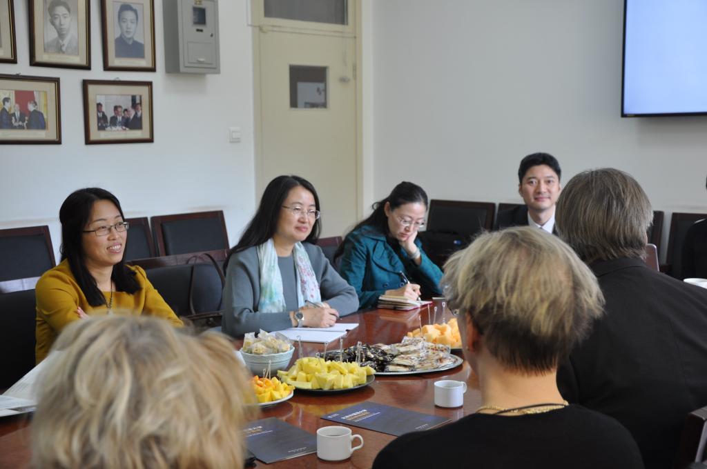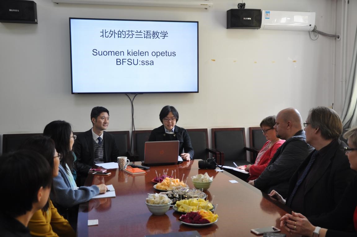 座谈会伊始,beat365在线唯一官网副院长董希骁对芬兰高中校长团的到访表示热烈的欢迎。随后,芬兰语教师杨新异对北外的芬兰语教学进行了简要介绍,给来访人员留下了非常深刻的印象。