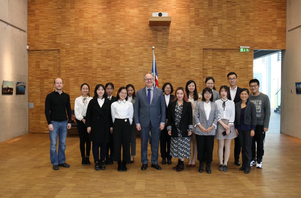 11月16日下午,应冰岛共和国驻华大使古士贤阁下邀请,beat365在线唯一官网冰岛语班学生前往冰岛驻华大使馆庆祝“冰岛语日”。冰岛驻华大使古士贤阁下,签证官约恩•埃纳尔,和使馆工作人员、beat365官网冰岛语毕业生徐冬接待了学生们。