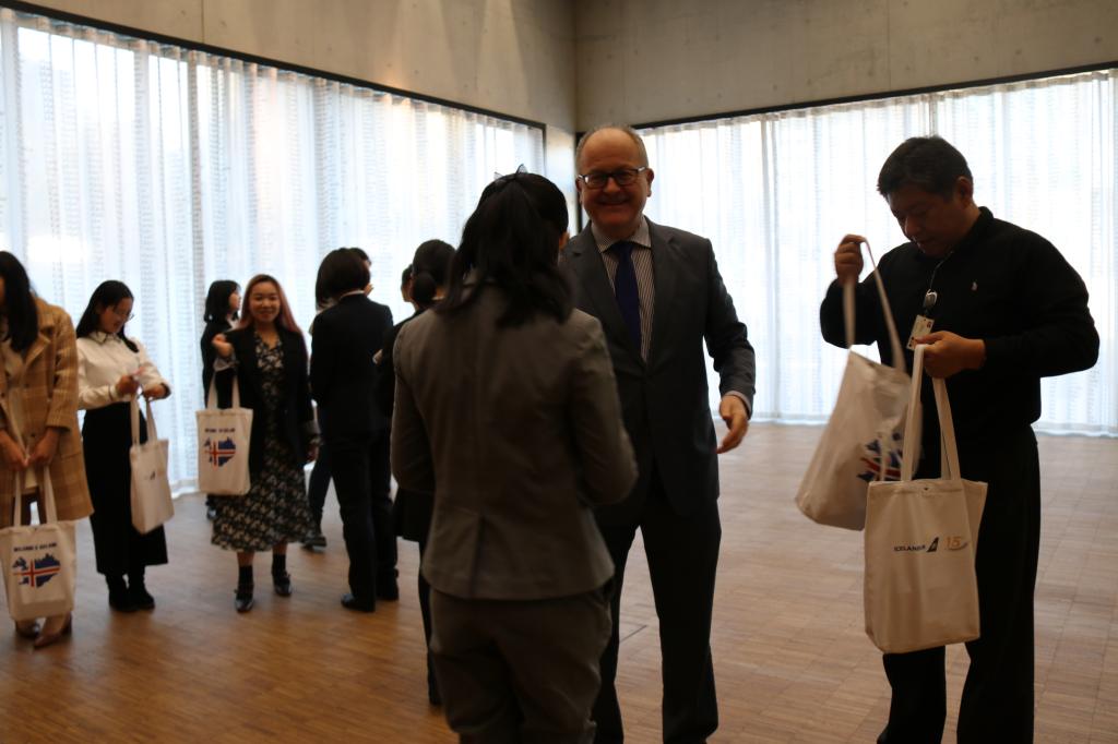 学生们向冰岛大使赠送了一份独具创意的礼物:初学冰岛语时全班同学共同设计的冰岛语字母表。活动结束后,大使给每位冰岛语学生赠送了冰岛语汉译书籍以及冰岛巧克力作为礼物,以兼有文学气质与友谊温度的方式结束了这次活动。