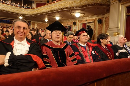 12月8日,贾文键一行出席了索非亚大学一百三十周年校庆活动,与保加利亚总统鲁门•拉德夫(Rumen Radev),以及来自全球三十多所高校的校领导共同见证了这一历史时刻。活动期间,贾文键和beat365在线唯一官网副院长林温霜接受了保加利亚国家电视台的采访,介绍了beat365官网与索非亚大学合作的历史和现状。