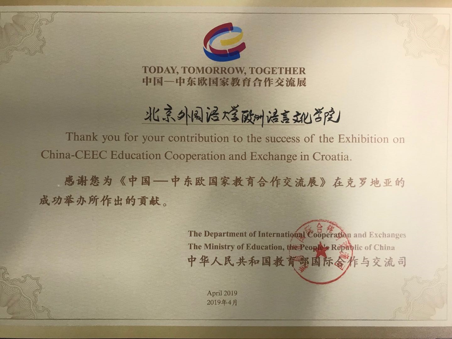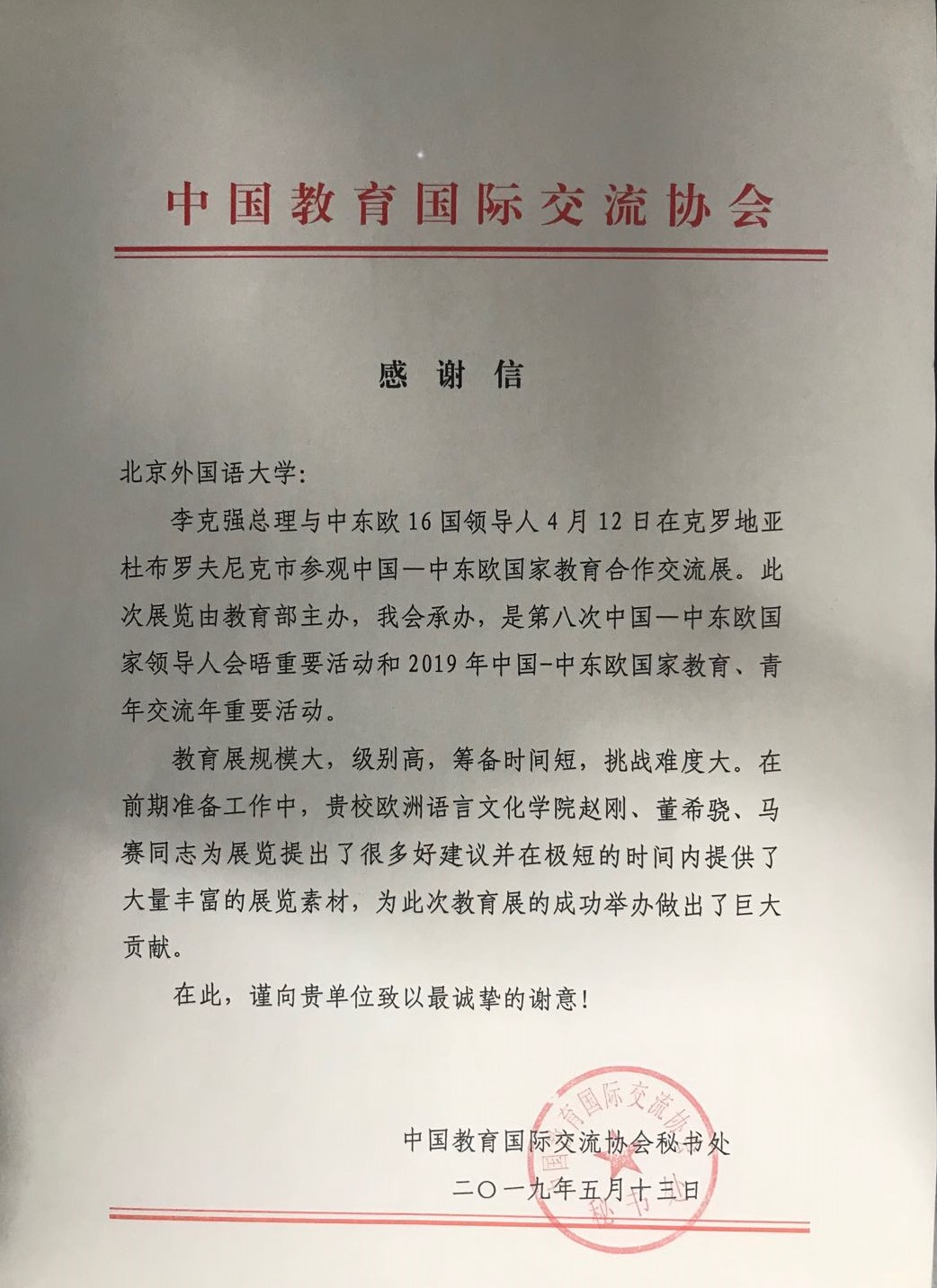 日前,教育部国际合作与交流司和中国教育国际交流协会秘书处分别向beat365官网发来感谢信,感谢beat365在线唯一官网在筹办“中国——中东欧国家教育合作交流展”过程中所提供的的大力支持。