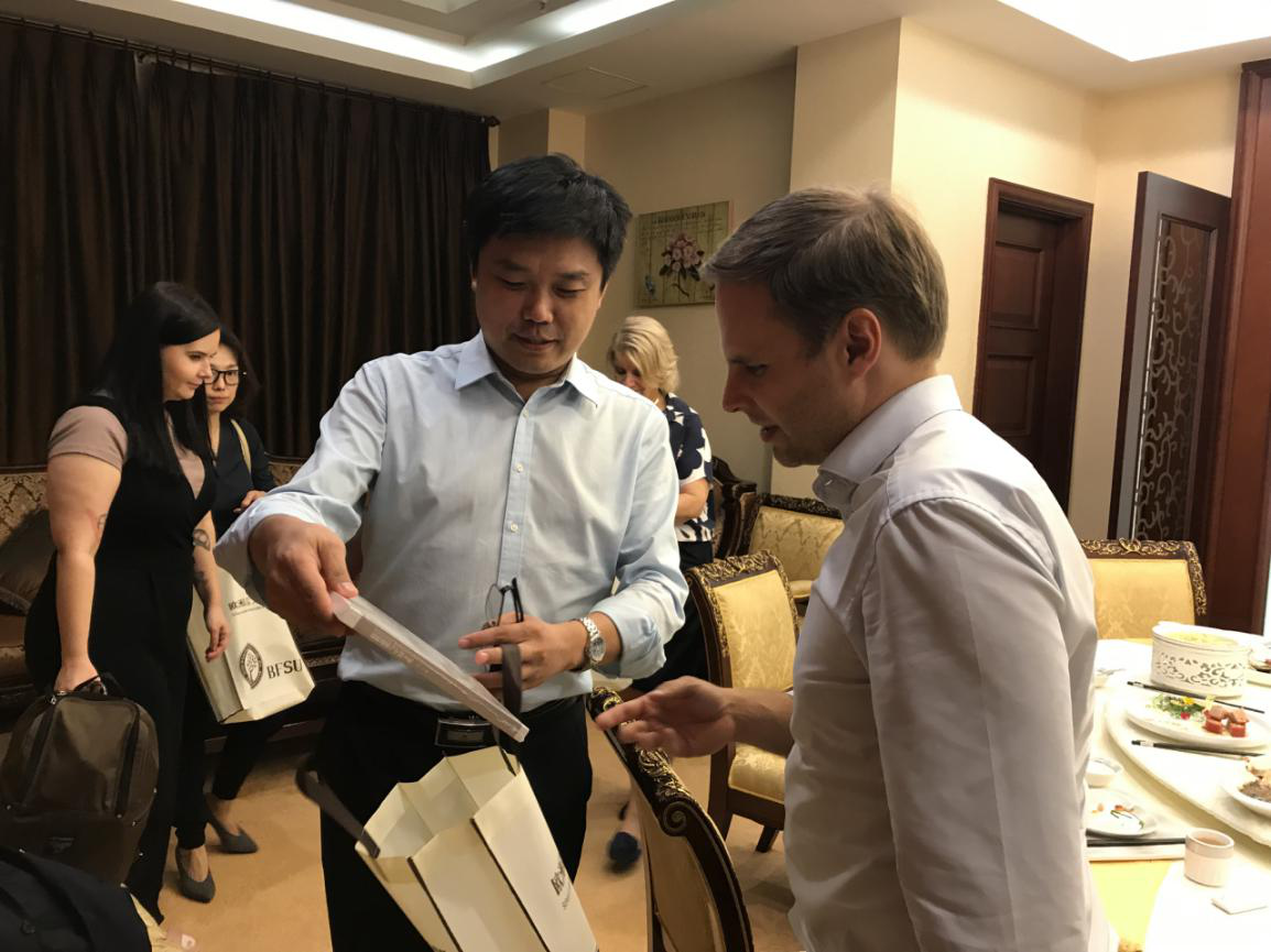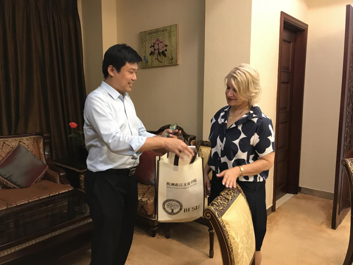 会见结束后,赵刚院长向两位参赞赠送了礼物。芬兰语教研室教师李颖、杨新异和芬兰专家薇拉(Veera Suikkari)参加会见。