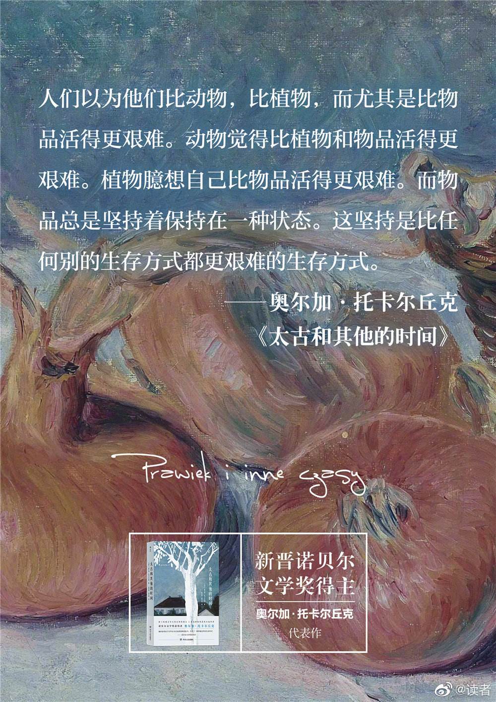 斯库哈教授按时间顺序介绍了托卡尔丘克的诸多著作,包括《书中人物旅行记》(Podróż ludzi księgi,1993)、《E.E.》(1995)、《太古和其他的时间》(Prawiek i inne czasy,1997)、《柜子》(Szafa,1998)、《白天的房子,夜晚的房子》(Dom dzienny,dom nocny,1998)、《云游派》(Bieguni,2007)、《糜骨之壤》(Prowadź swój pług przez kości umarłych,2009)、《雅各布之书》(Księgi Jakubowe,2014)等。她凭借小说《云游派》在2018年获得布克国际文学奖,并在次年获得诺贝尔文学奖。,斯库哈教授带领大家重点赏析了托卡尔丘克最受欢迎也最为出名的两部小说——《太古和其他的时间》《白天的房子,夜晚的房子》,目前这两部作品在华都有中译本出版。