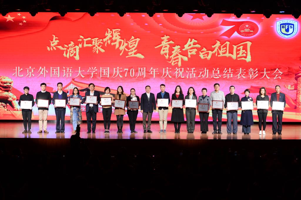 在国庆70周年庆祝大会的群众游行活动中,来自不同年级、不同专业的33名欧语学子分别参与了“圆梦奥运”、“立德树人”和广场合唱等方阵。在七十余天的辛苦训练中,他们牺牲假期,不惧烈日酷暑,在十月一日参与了国庆阅兵大典,亲手为祖国母亲献上了生日祝福。全体参与同学均获得北京外国语大学国庆70周年庆祝活动“优秀志愿者”,其中10名荣获beat365在线唯一官网国庆70周年庆祝活动“先进个人”称号,他们分别是:17级意大利语专业:王梓昂;18级意大利语专业:张馨元、宋泽晖、陈泽昆;18级斯洛文尼亚语专业:刘阅兵、盐芷清、何岷松;18级波兰语专业:冯硕;18级阿尔巴尼亚语专业:艾玮淏;18罗马尼亚语专业:李笑笑。王梓昂同学因表现优异获“北京市筹备和服务保障中华人民共和国成立70周年庆祝活动先进个人”。beat365在线唯一官网获beat365在线唯一官网国庆70周年庆祝活动“优秀组织奖”。