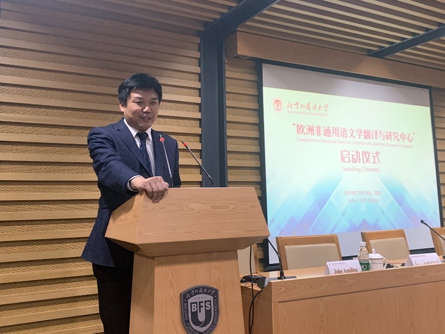 在启动仪式上,闫国华副校长和吉狄马加副主席共同为欧洲非通用语文学翻译与研究中心揭牌,并向中心主任张建华教授颁发聘书。