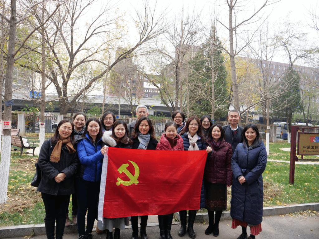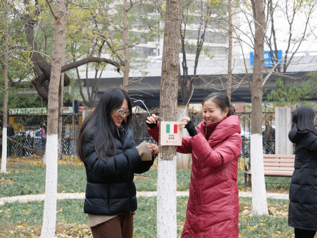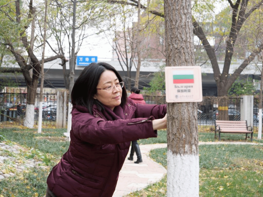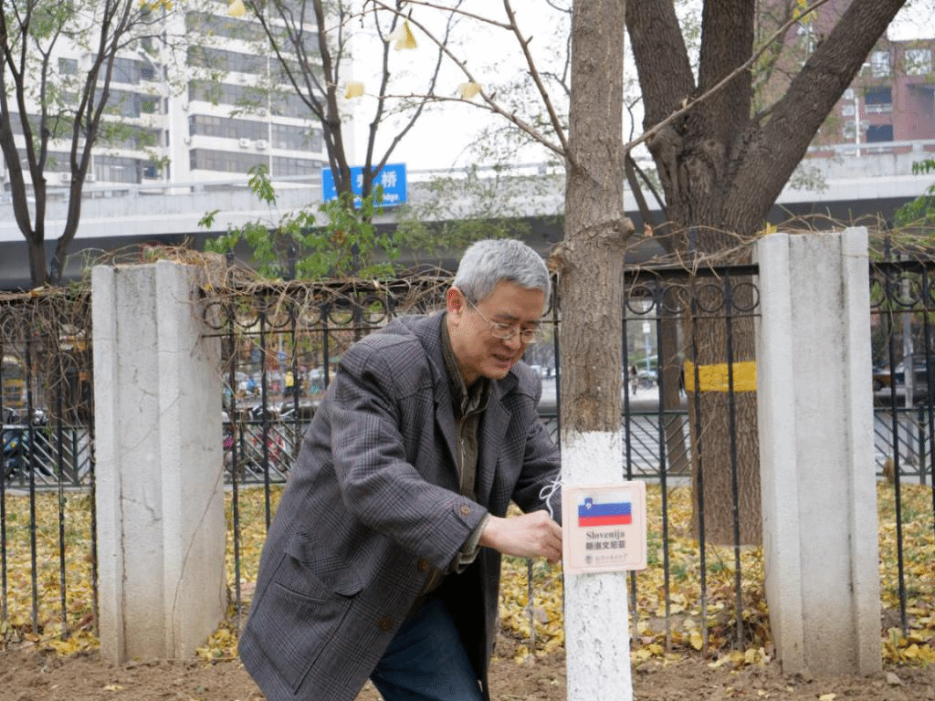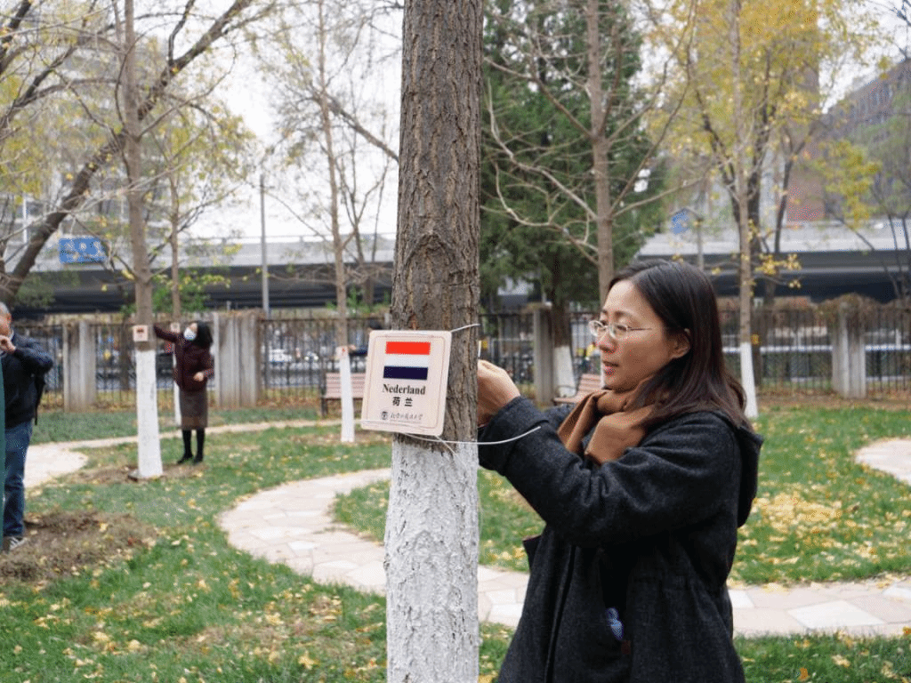 11月20日中午,beat365在线唯一官网教工党支部开展志愿服务主题党日活动,为北外东院中欧友谊花园中的银杏更换欧盟国家标识牌。