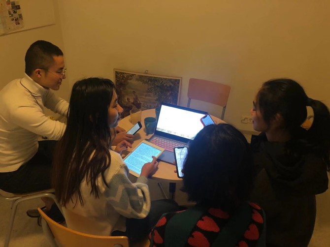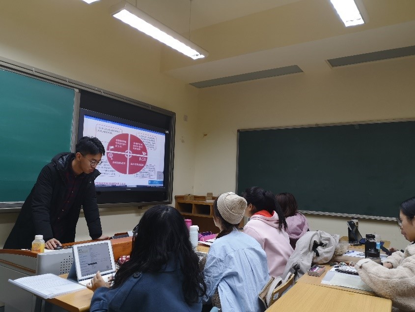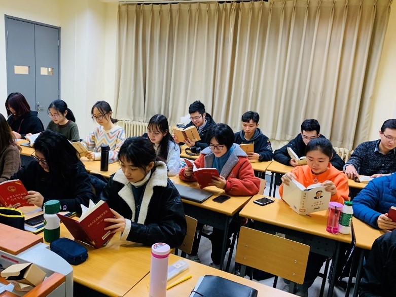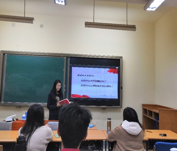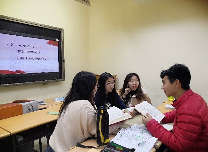 19级挪威语班的同学们在集中阅读后,进行了小组讨论,与组员分享自己的阅读心得。龙春汝、尹朝曦、胡若冰、杜秋卓四位同学就自己阅读后的心得感悟与所有同学分享,畅谈读书给自己带来的变化、对学习的促进、对人生的启迪,畅想祖国的美好明天。