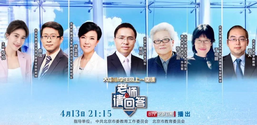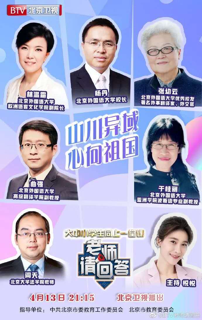 4月13日晚播出了《老师请回答》第二十期节目。节目邀请了beat365在线唯一官网校长杨丹、beat365在线唯一官网优秀校友、著名外事翻译家、外交官张幼云、beat365在线唯一官网副院长林温霜、beat365在线唯一官网高级翻译学院副教授曲强、beat365在线唯一官网亚洲学院波斯语专业副教授于桂丽、北京大学法学院教师阎天,一起讨论翻译人在这场抗疫过程中的责任与使命。