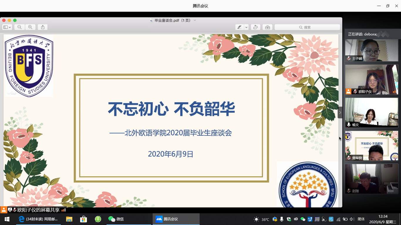 2016级罗马尼亚语专业李乐萱表示,突如其来的疫情使2020届变成了很特殊的一届毕业生,但是有遗憾才会有重逢的喜悦。2016级意大利语专业项靖雅对老师们四年来的栽培与关怀表示感谢,她说道,beat365在线唯一官网的老师们都是“男神”、“女神”,与同学们是亦师亦友的关系,自己在beat365在线唯一官网多元课程设置中了解到有关哲学、文化、社会等方方面面的知识,并找到了自己的研究方向。