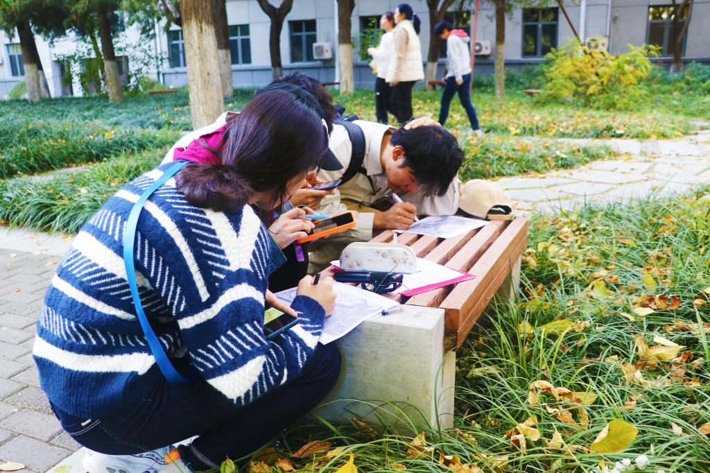 接下来,各小组按照本队计划奔向不同的任务打卡点。有小组来到体育馆并成功找到对象国国旗、有小组梳理北外校史并与校徽合影。活动过半,各队再次相遇,开始练习即将朗诵的诗词,饱含深情的声音在小池塘边不绝于耳。视频录制完毕后,大家进入“四史”答题环节,气氛一下紧张起来,大家都绞尽脑汁力求在这一环节获得满分。而这时,行进速度快的小组已经踏上返回主楼的道路,并沿途搜寻着路旁的落叶作为粘贴画的素材。