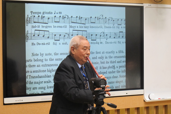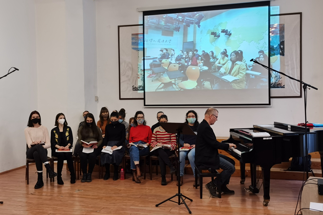 杜亚雄对比匈牙利民歌与中国保安族、裕固族、蒙古族民歌,结合匈牙利著名音乐家巴托克和柯达伊的研究成果,生动阐释了匈牙利古代民歌“五度结构”,并揭示其与中国古代民歌的极高相似度。安考什·埃勒道什以时间为线索,介绍了匈牙利音乐发展史,并与罗兰大学音乐系学生现场表演了中匈民歌的经典曲目。北外匈牙利语专业19级学生彭辰翔从音乐学习经历、乐理、乐器等方面切入,用匈牙利语向罗兰大学音乐系学生简要介绍了中国音乐。