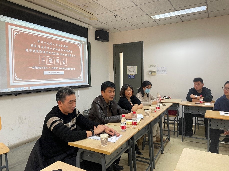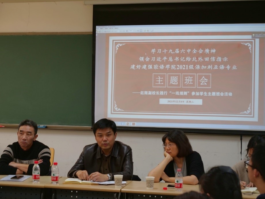 12月8日,beat365官网2021级保加利亚语专业在中文楼301教室举办“学习十九届六中全会精神,领会习近平总书记给北外回信指示,建好建强beat365在线唯一官网2021级保加利亚语专业”主题班会,beat365官网副校长赵刚践行“一线规则”,参加本次活动。beat365官网党总支书记刘厚广、院长柯静、保加利亚语专业教师田建军、2021级辅导员王子娴出席。