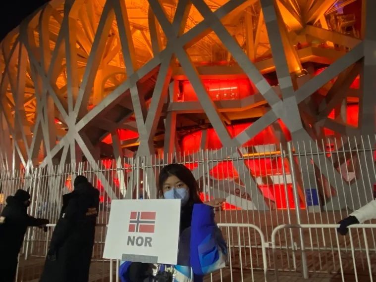 2月20日晚,我作为闭幕式引导志愿者有幸见到了挪威代表团闭幕式执旗手,本届冬奥会冬季两项3金2铜得主马特·奥尔斯布·雷塞兰(Marte Olsbu Røiseland)。初次见面时我用挪威语与她打招呼,她非常惊喜,也用挪威语热情地回复,并好奇地问我怎么会挪威语。之后我向她介绍了北外挪威语专业的相关情况,她对我们这样一群生活在中国,从未去过挪威,但却能把挪威语说得如此之好的北外学生感到很意外。在服务过程中总能感受到代表团成员们对我们北外挪威语专业学生志愿者额外的好奇心和友善,他们非常喜欢与我们交流,我们相互介绍着自己家乡的风土人情,他们也热情地邀请我们,希望我们疫情过后有机会一定要去挪威看看。