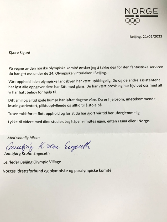 我谨代表挪威奥林匹克委员会向你在北京举办的第24届冬季奥林匹克运动会期间为我们提供的出色志愿服务表示感谢。