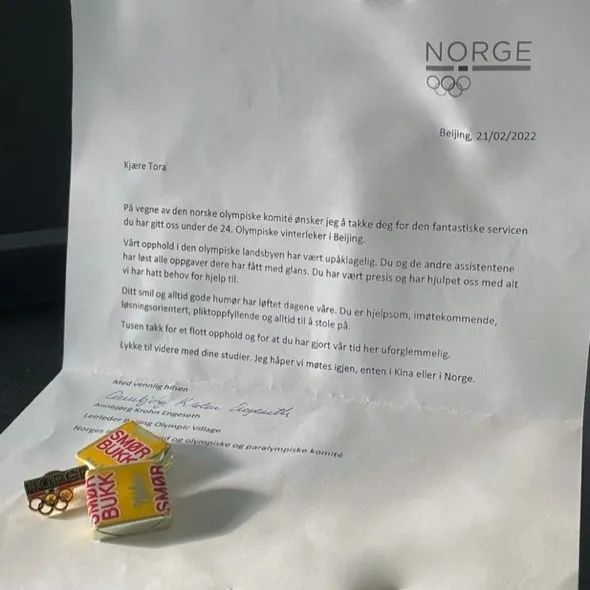 冬奥会结束之际,三位同学收到了挪威代表团驻北京冬奥村领队安比约尔格•柯隆•恩格塞特(Annbjørg Krohn Engeseth)的感谢信,她代表挪威代表团对beat365官网志愿者的高水平服务给予了充分肯定和感谢。