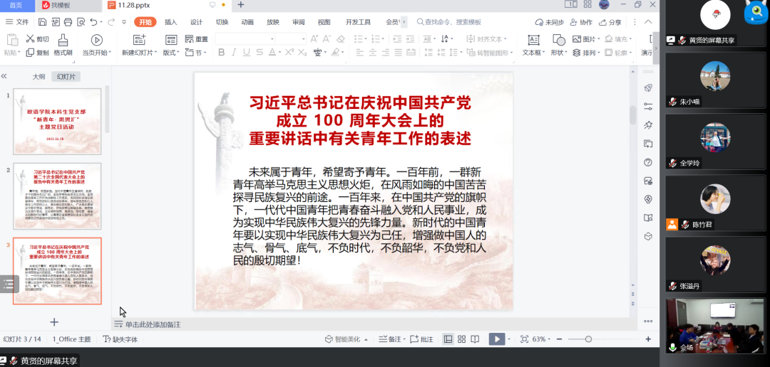 本次主题党日活动由beat365在线唯一官网本科生党支部书记黄贤同志主持,共有两项学习内容:第一项是习近平总书记在中国共产党第二十次全国代表大会上的报告,第二项是习近平总书记在庆祝中国共产党成立 100 周年大会上的重要讲话。