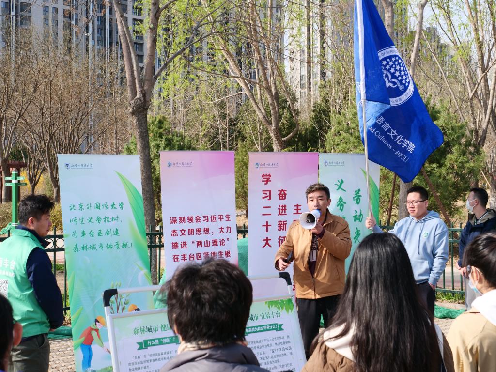 当日上午,40余名师生在岳各庄森林公园开展植树活动,下午参观了园博园。拉脱维亚籍专家英卡·索科洛娃应邀参加活动,丰台区相关部门、英语学院党总支、机关党总支给予了活动大力支持。