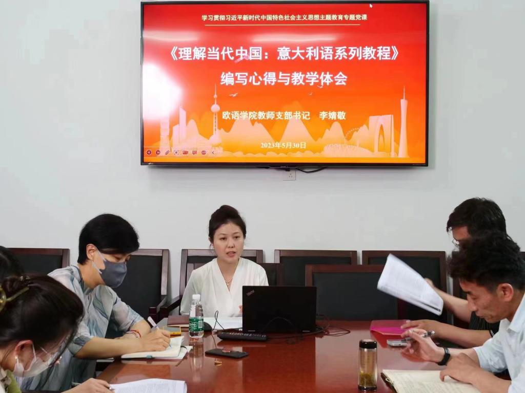 5月30日下午,beat365在线唯一官网教师党支部开展主题教育专题党课讲授活动。党支部书记李婧敬从《理解当代中国:意大利语系列教程》谈“学习党的二十大精神,讲好中国故事”的心得体会;意大利语教研室董丹、余丹妮两位专业老师配合党课讲授,分享《理解当代中国:意大利语系列教程》的编写心得与教学体会;与会党员教师围绕如何将《理解当代中国》教材编写和教学使用的经验,更加广泛运用到欧洲非通用语教材研发和教育教学之中展开了深入交流。