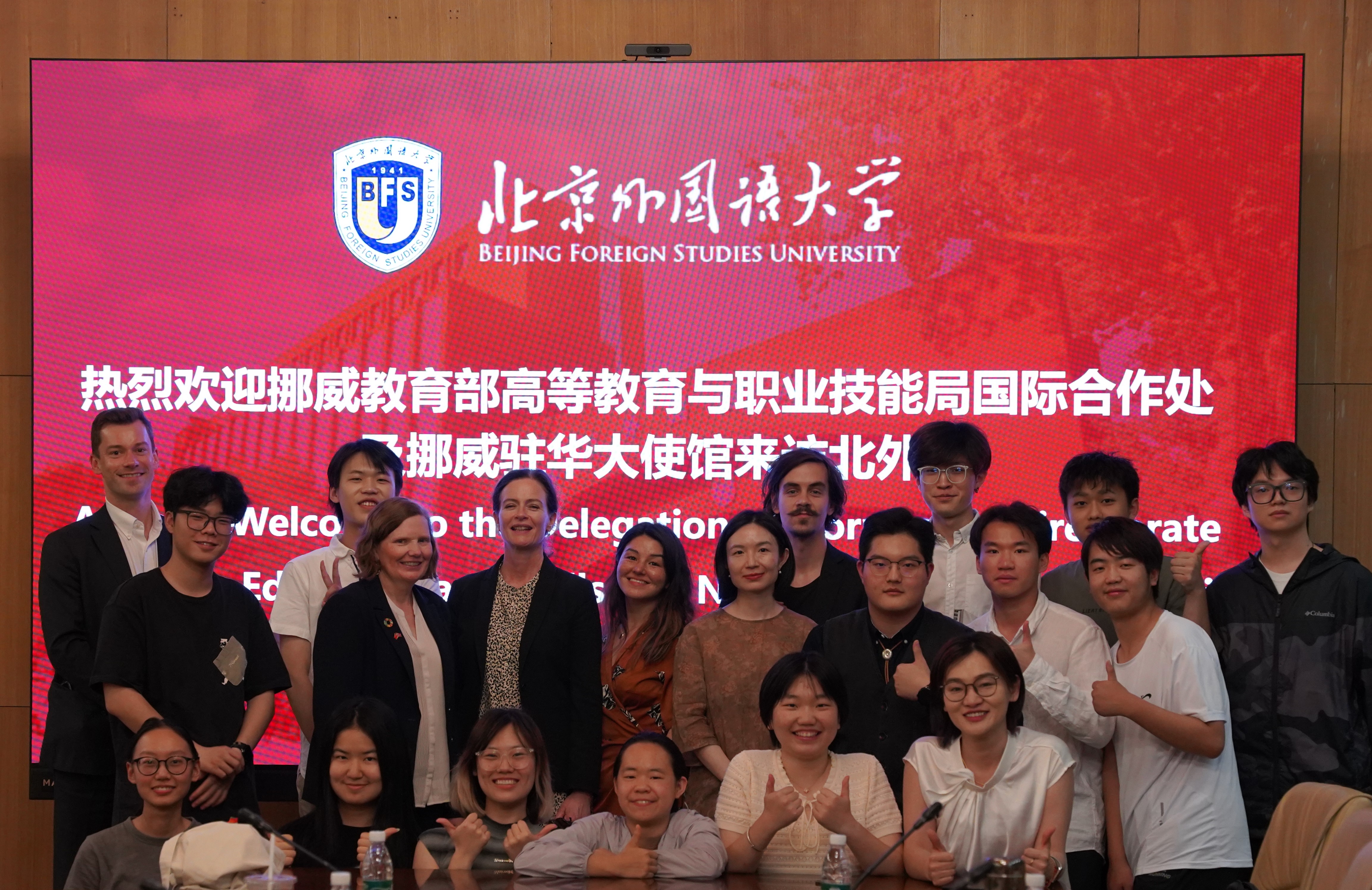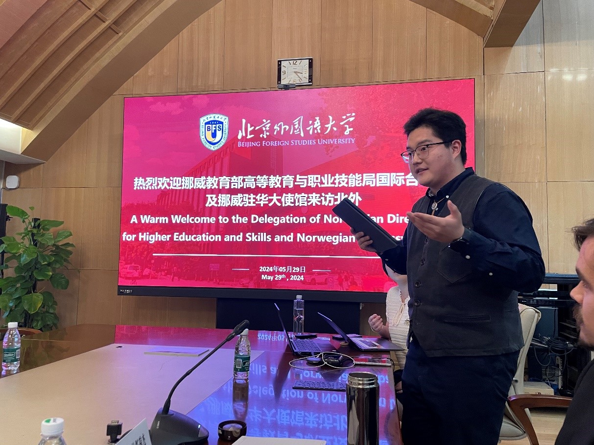 国际处处长和静向代表团介绍了北外学科建设、人才培养、社会服务、国际合作取得的成绩。她表示,外语是对外交流的重要工具,北外秉承“深化中外交流,增进各国人民友谊,推动构建人类命运共同体,讲好中国故事”的宗旨,通过101种外国语言集聚教育合作力量,培养优秀外语人才,以语言相通促民心相通,推动文明交流互鉴。北外通过“学生海外实习实践项目”探索育人新路径,努力培养“三有”复合型人才,希望与挪威教育部、高校及科研院所开展更广泛教育合作,培养国际化人才。
