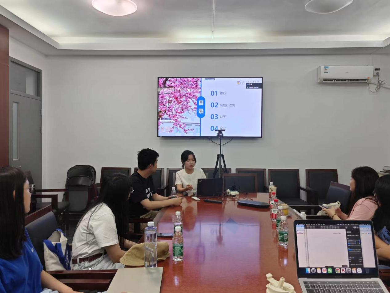 潘晨和袁茵作为考公代表,细致入微且毫无保留地分享了国家和省级公务员考试的备考流程、时间线安排、国家与省级公务员考试的内容差异等内容,结合笔面试准备过程,提出了诸多值得注意的要点和备考建议。淡恬旖和宫陶铭分享了参加企业招聘的心路历程、应聘经历和实用技巧,包括实习历程、求职信息筛选、备考技巧和面试经验等,尤其在择业中涉及的地域观和心态调试等方面,为与会低年级研究生同学带来了探索未来更多可能性的多元化思考。博士成功上岸同济大学的陈悦学姐分享了跨专业考博申请历程,为有志于继续在学术界求索的同学们带来了宝贵的借鉴和有益启示。