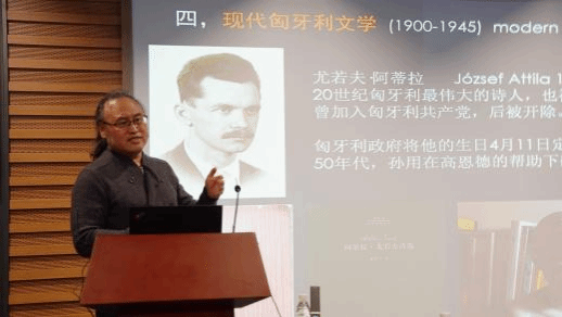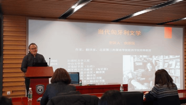 在讲座的后半场,余泽民重点介绍了当代匈牙利文学名家名作,匈牙利文学在中国传播的脉络和重要作家作品在中国的接受,为在场听众勾勒出匈牙利当代文坛的概貌。