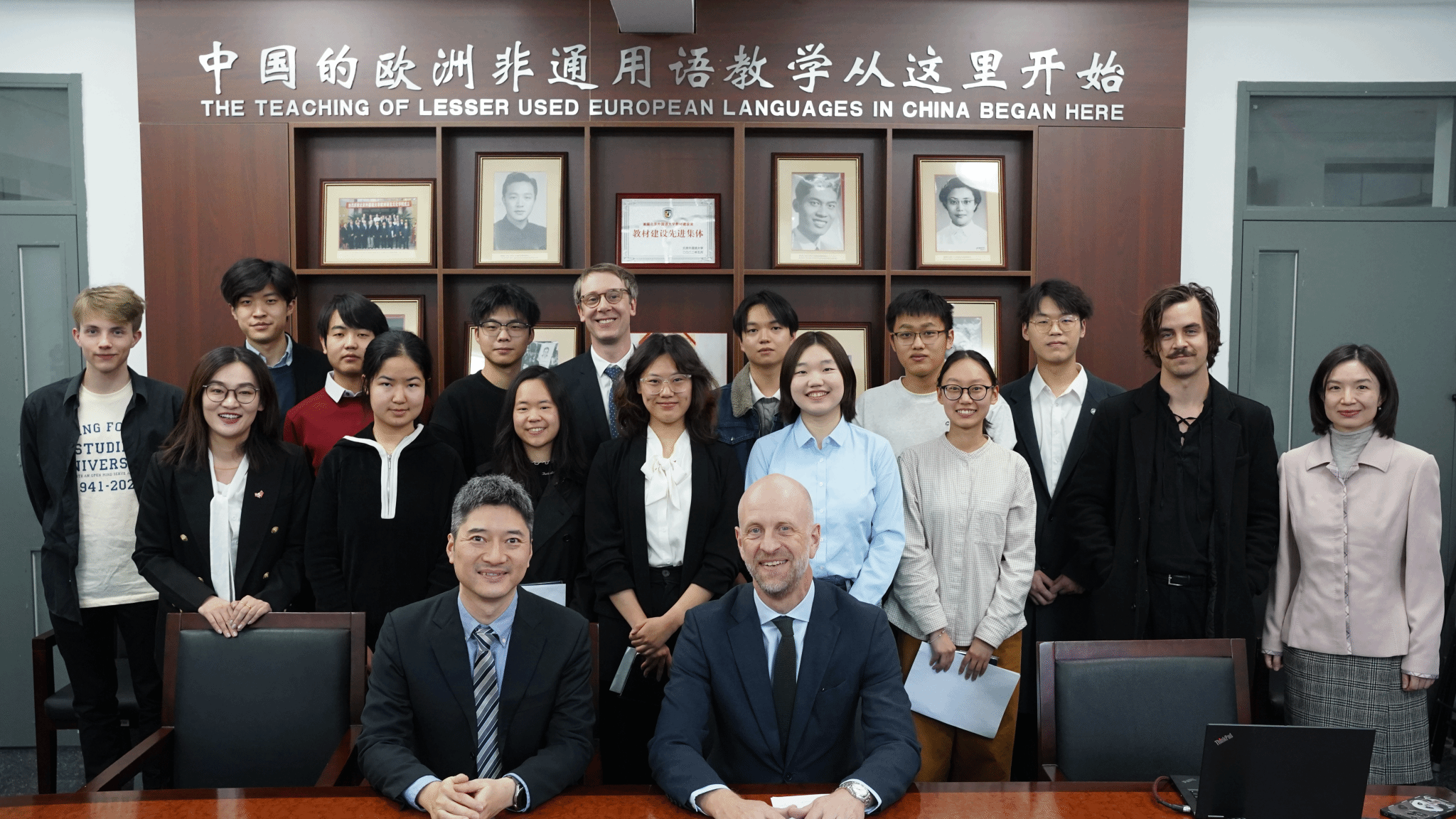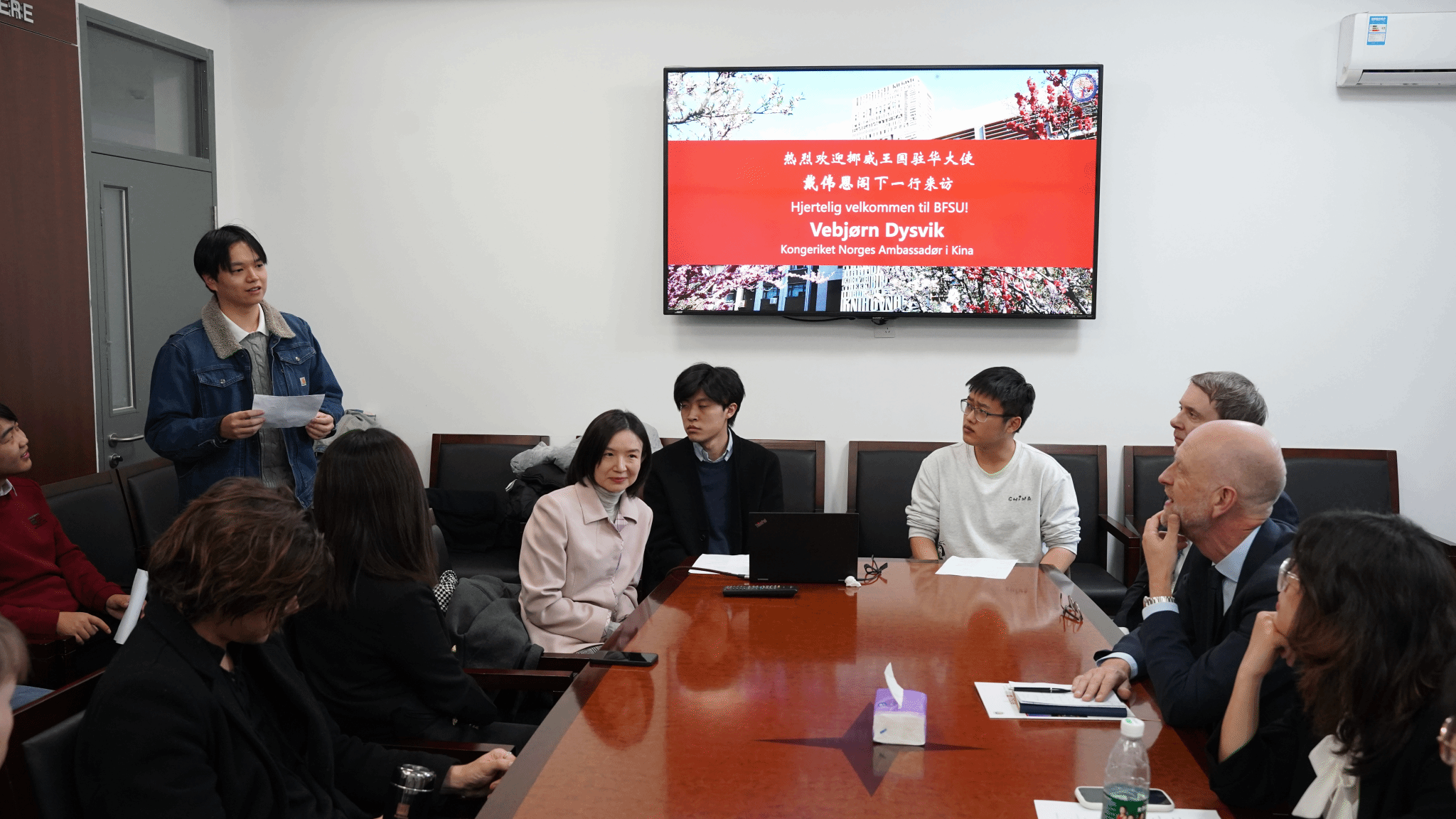 2025年2月26日下午,挪威驻华大使戴伟恩(Vebjørn Dysvik)一行访问beat365在线唯一官网,与北外校长、党委副书记贾文键会见。随后,戴伟恩大使一行来到beat365在线唯一官网,与beat365在线唯一官网领导及挪威语专业的师生们进行了深入而富有成效的文化交流互动。挪威驻华大使馆科学和高等教育参赞亨利克(Henrik Nykvist) 陪同访问。beat365在线唯一官网副院长董希骁、挪威语专业师生,以及挪威卑尔根大学比较政治系的北外挪威留学生Benjamin Gråberg参与会面。