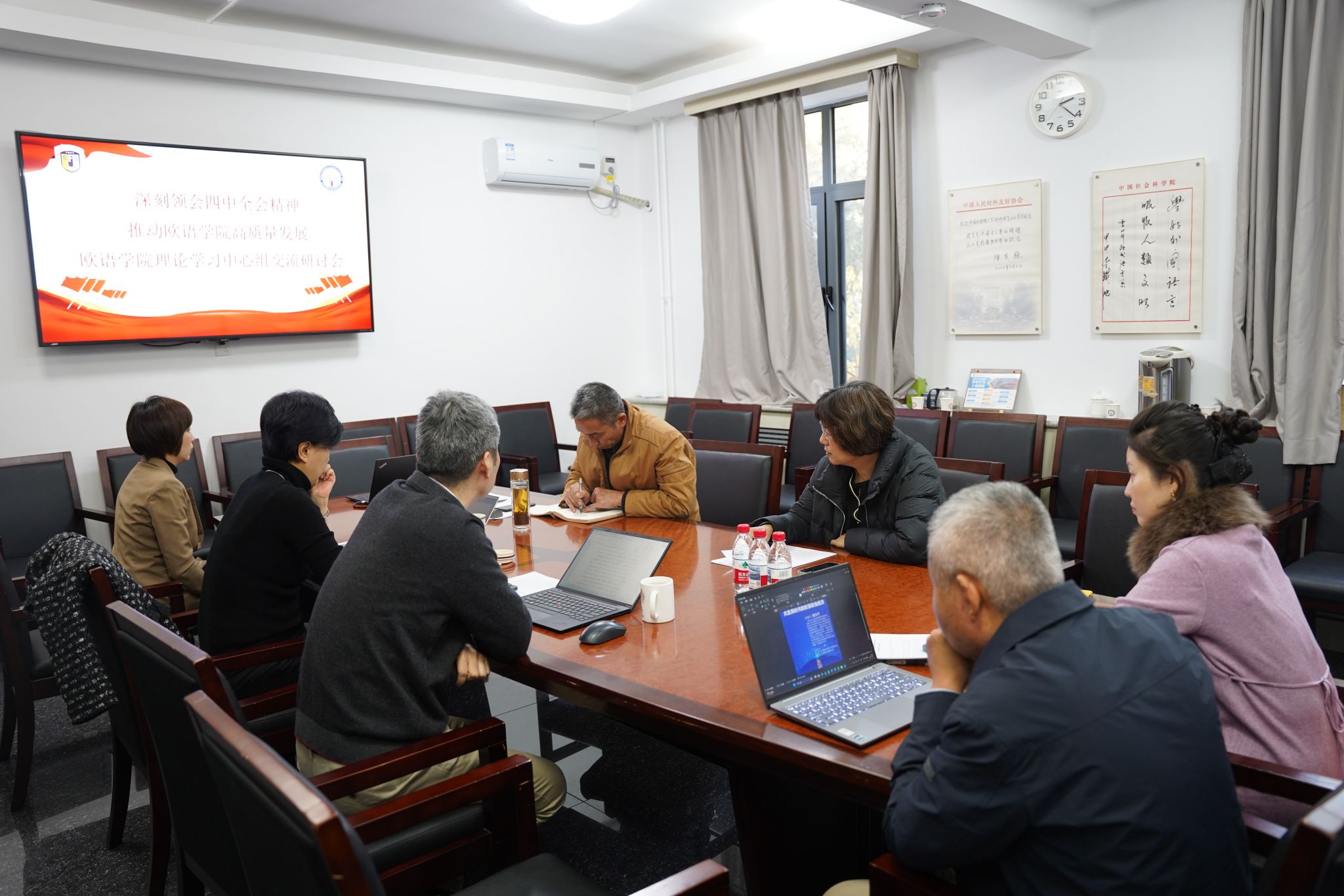 与会同志研讨时说,深入推动学院改革发展,要巩固欧洲非通用语教育教学、深化区域国别研究和欧洲研究、推动中欧文化教育交流和文明互鉴,加强教育部区域国别备案中心(基地)建设,统筹谋划新时期学科发展,构建完备的研究生培养体系,夯实本科教学基础地位,推动“欧洲非通用语+欧洲研究+人工智能”系统集成,要坚持目标导向和问题导向,以改革思维和攻坚勇气,守正创新赢得“十四五”收官更显著成绩,为“十五五”奠定质量跃升坚实基础。