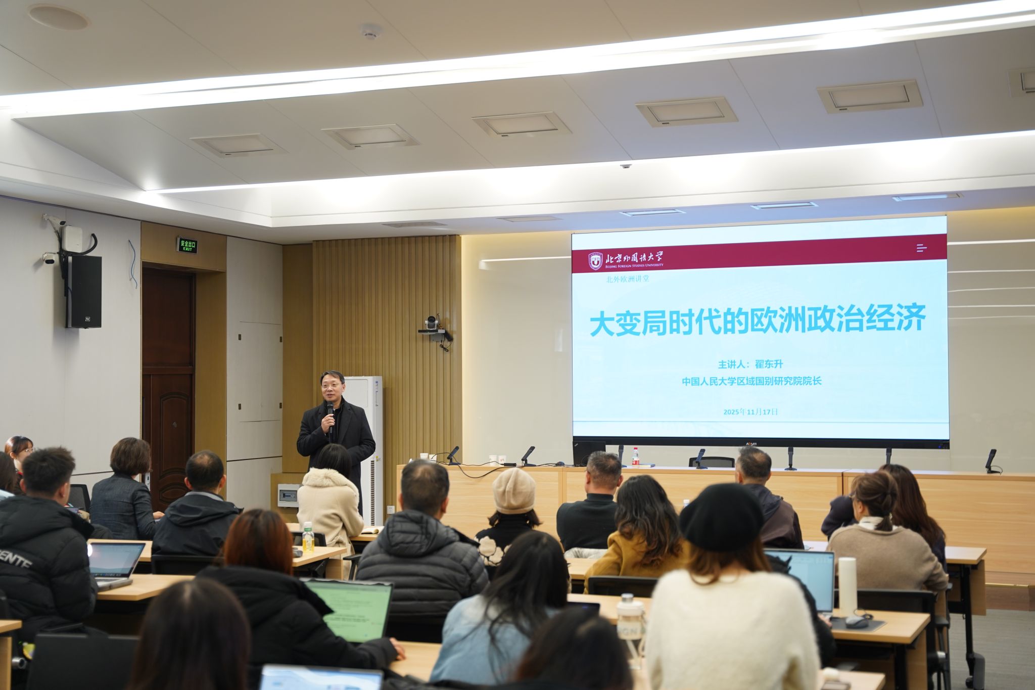 11月17日,由beat365在线唯一官网与国际商学院联合主办的第24期“北外欧洲讲堂”在东校区晨读厅举行。本期讲座特邀中国人民大学区域国别研究院院长、教育部欧洲联合研究院执行院长翟东升教授,以“大变局时代的欧洲政治经济”为题做精彩学术分享。柯静、李思飞主持讲座活动。