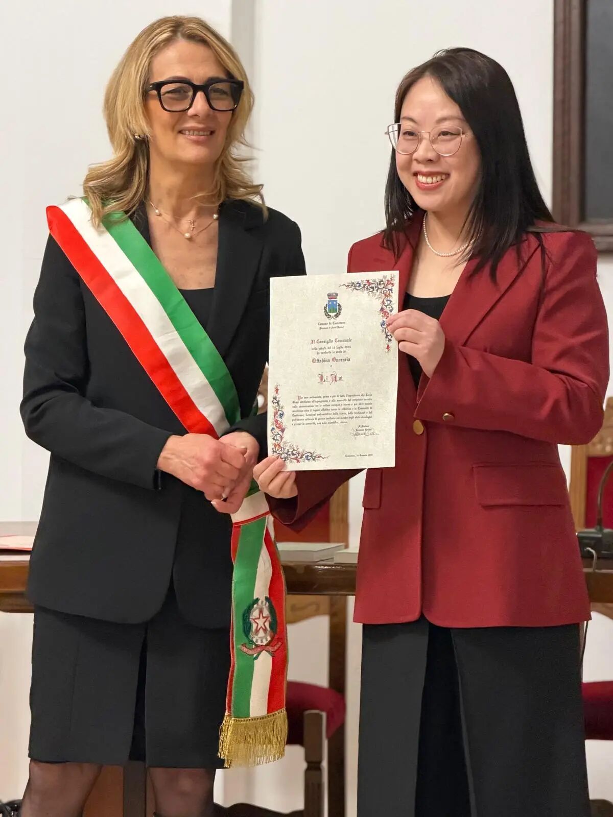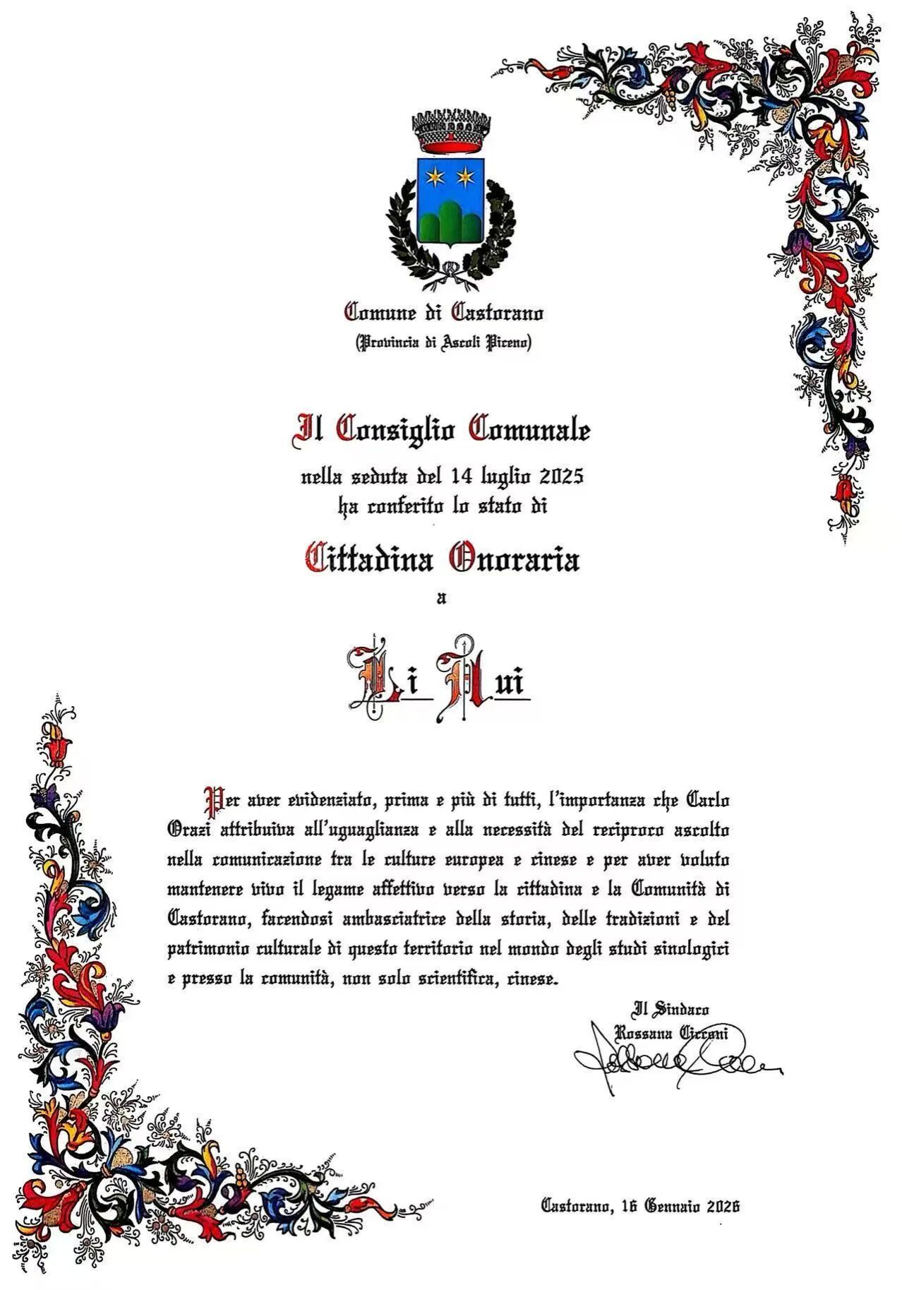 2026年1月16日,beat365在线唯一官网拉丁语专业副教授李慧,在意大利马尔凯大区阿斯科利省卡斯托拉诺市(Castorano, Ascoli Piceno)正式获授 “荣誉市民”(Cittadinanza Onoraria)称号。这一荣誉由卡斯托拉诺市政府授予,旨在表彰其在学术研究与中意文化交流领域作出的长期而卓越的贡献。