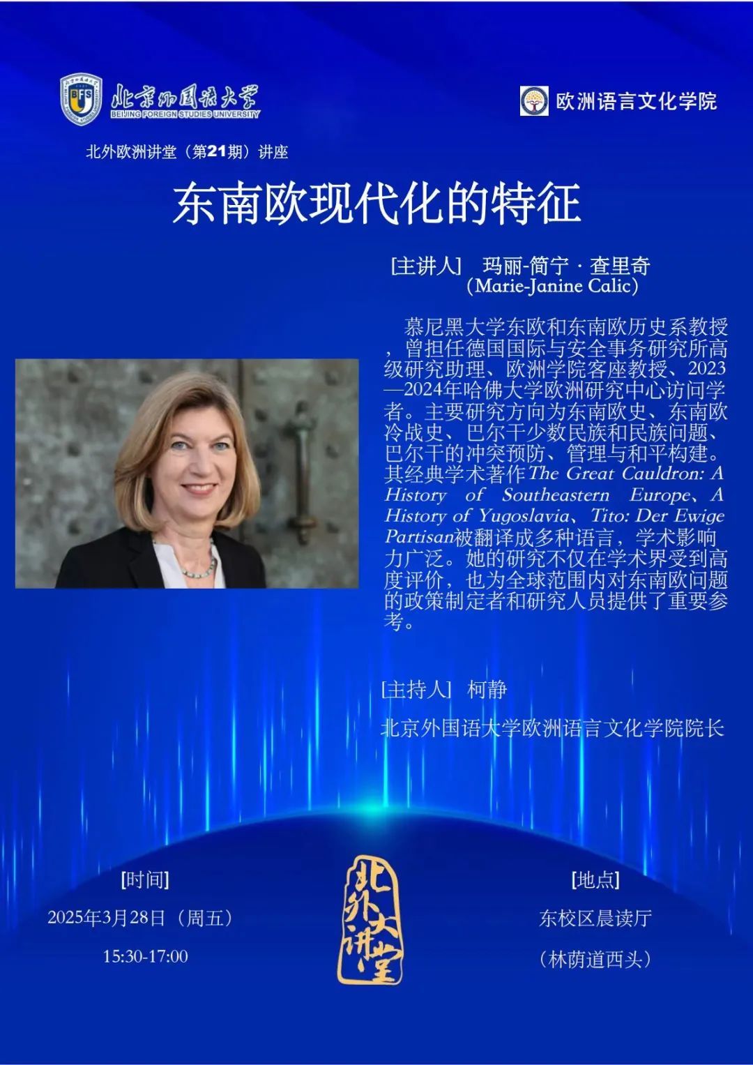 3月28日,第21期”北外欧洲讲堂”将邀请德国慕尼黑大学东欧和东南欧历史系教授玛丽-简宁·查里奇(Marie-Janine Calic)带来题为“东南欧现代化的特征”的讲座。