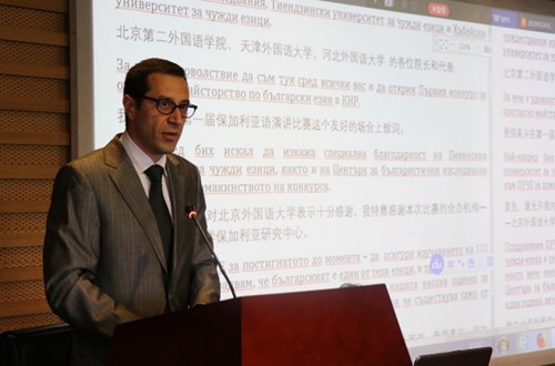 闫国华在致辞中表达了对各界保语学者的欢迎,称赞了保加利亚的灿烂文化,希望进一步加强与保加利亚驻华使馆的交流合作。保加利亚驻华大使波罗扎诺夫在致辞中高度评价了北外保语专业、北外保加利亚语研究中心所取得的成就,并寄语参加比赛的诸位学子赛出风采,赛出水平。