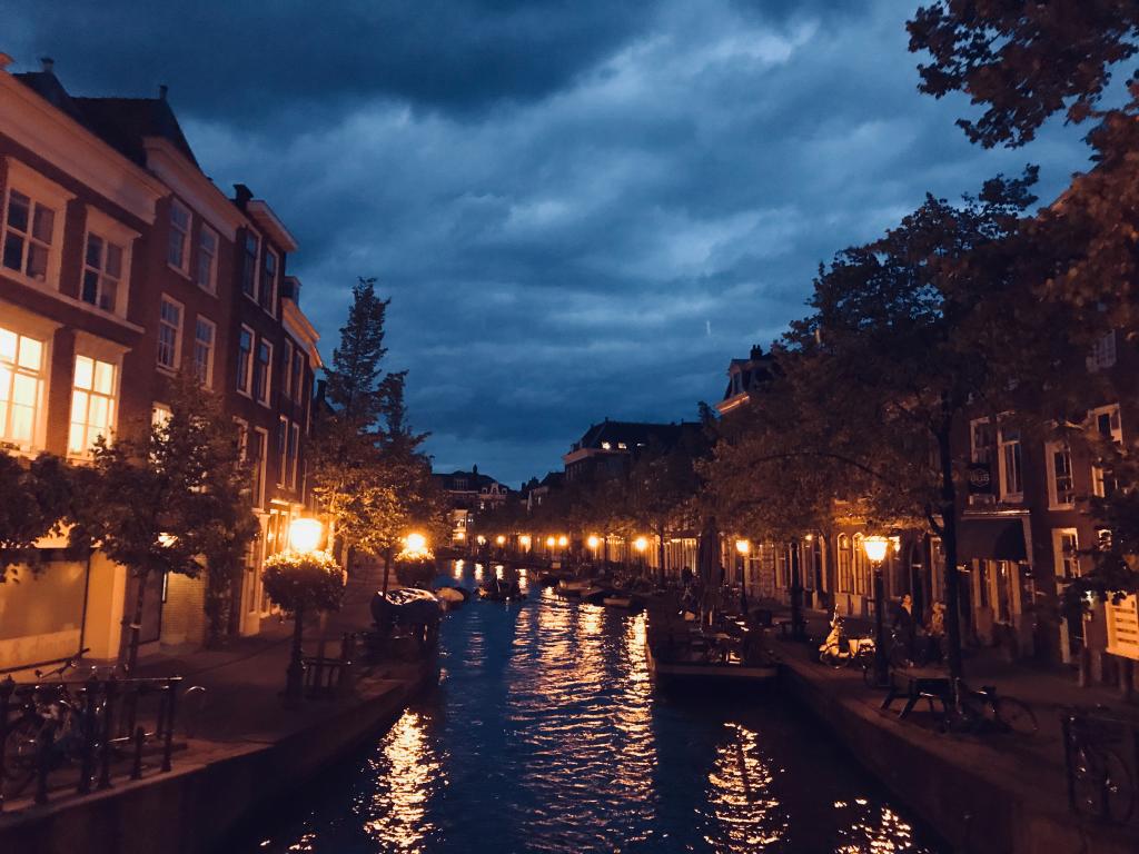 Er zijn veel grachten binnen de stad Leiden, net als Amsterdam. Maar de avond in Leiden is veel mooier dan die in Amsterdam. Er zijn niet zo veel toeristen. Het oranje licht wordt weerspiegeld in de grachten, warm en sereen, zoals het schilderij van Van Gogh.