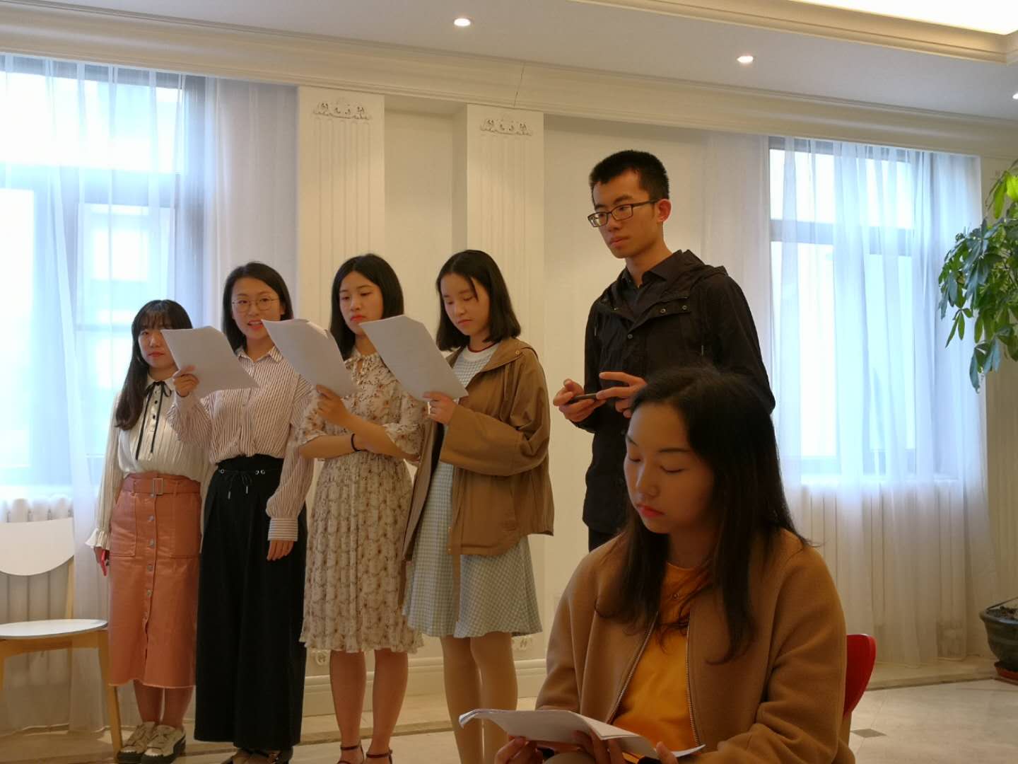在文化沙龙正式开始前,两位专家观看了斯洛文尼亚语班同学们为北外欧洲多语种戏剧大赛准备的剧目表演,并从台词、动作、面部表情、舞台效果等多方面为同学们提供了详细的指导。同时,同学们也结合专家意见,积极提出自己想法,与两位专家亲切交流。