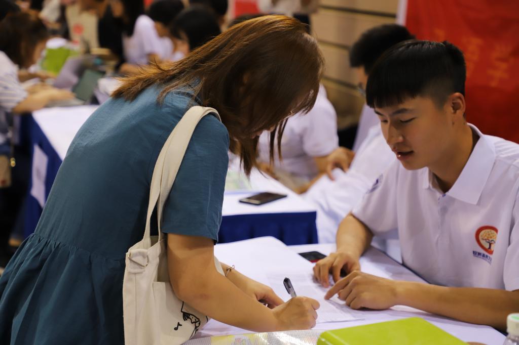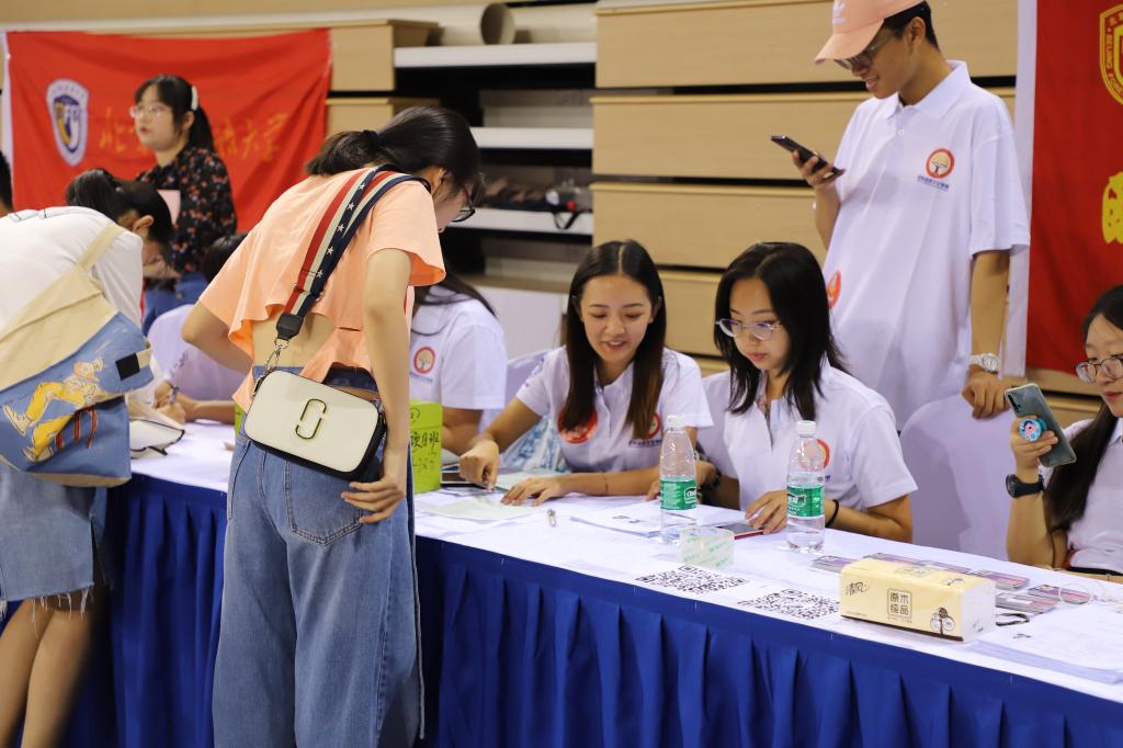 上午8点,迎新工作在体育馆二层正式开始。beat365在线唯一官网负责迎新的同学们身着统一的院服,在杨文老师和张传玮老师的指导下有条不紊地进行迎新工作:签到、扫码、收取档案和户口材料、发放一卡通和学院新生大礼包、签名及拍照留念等等,一切都进行得井然有序。